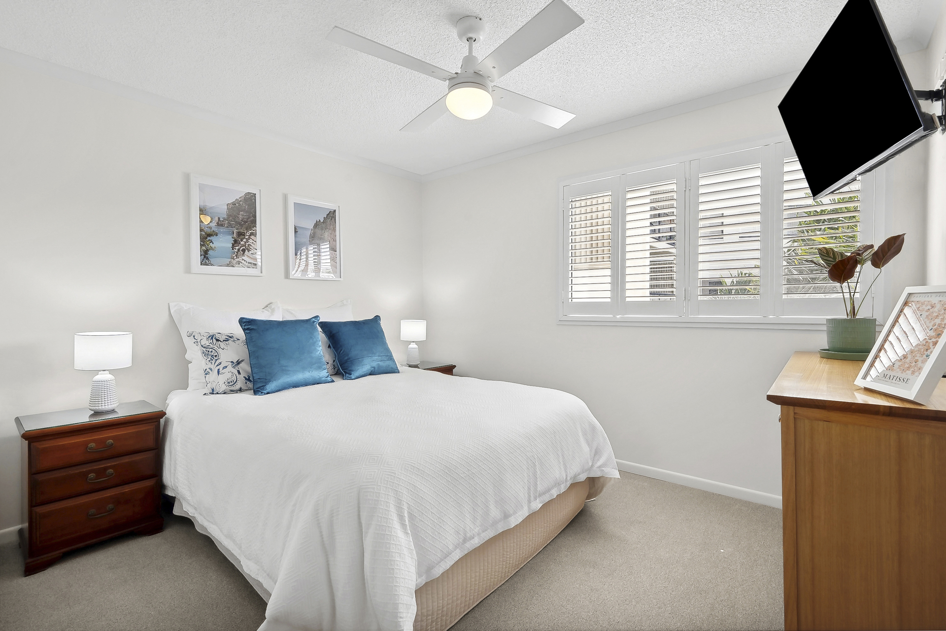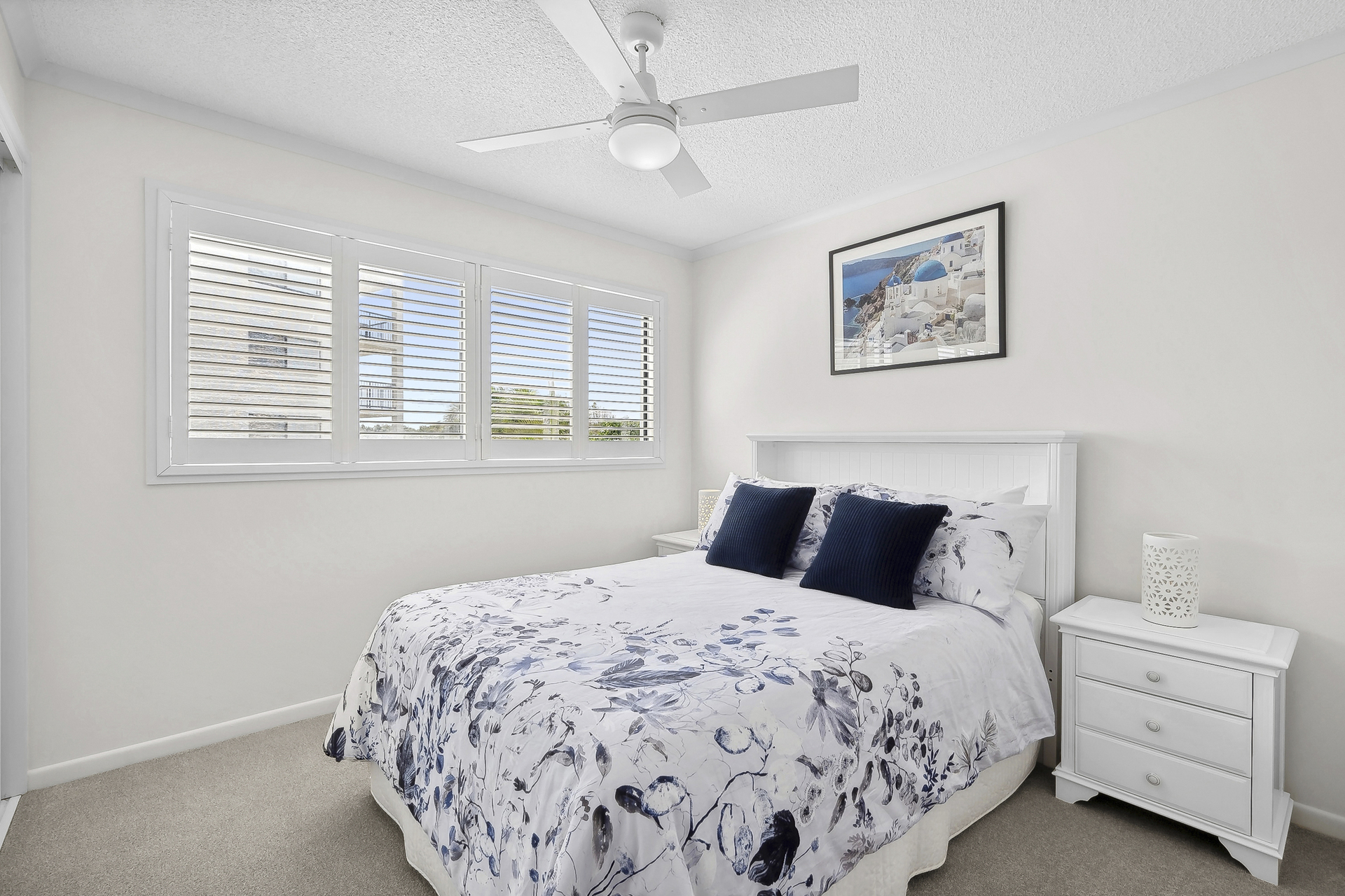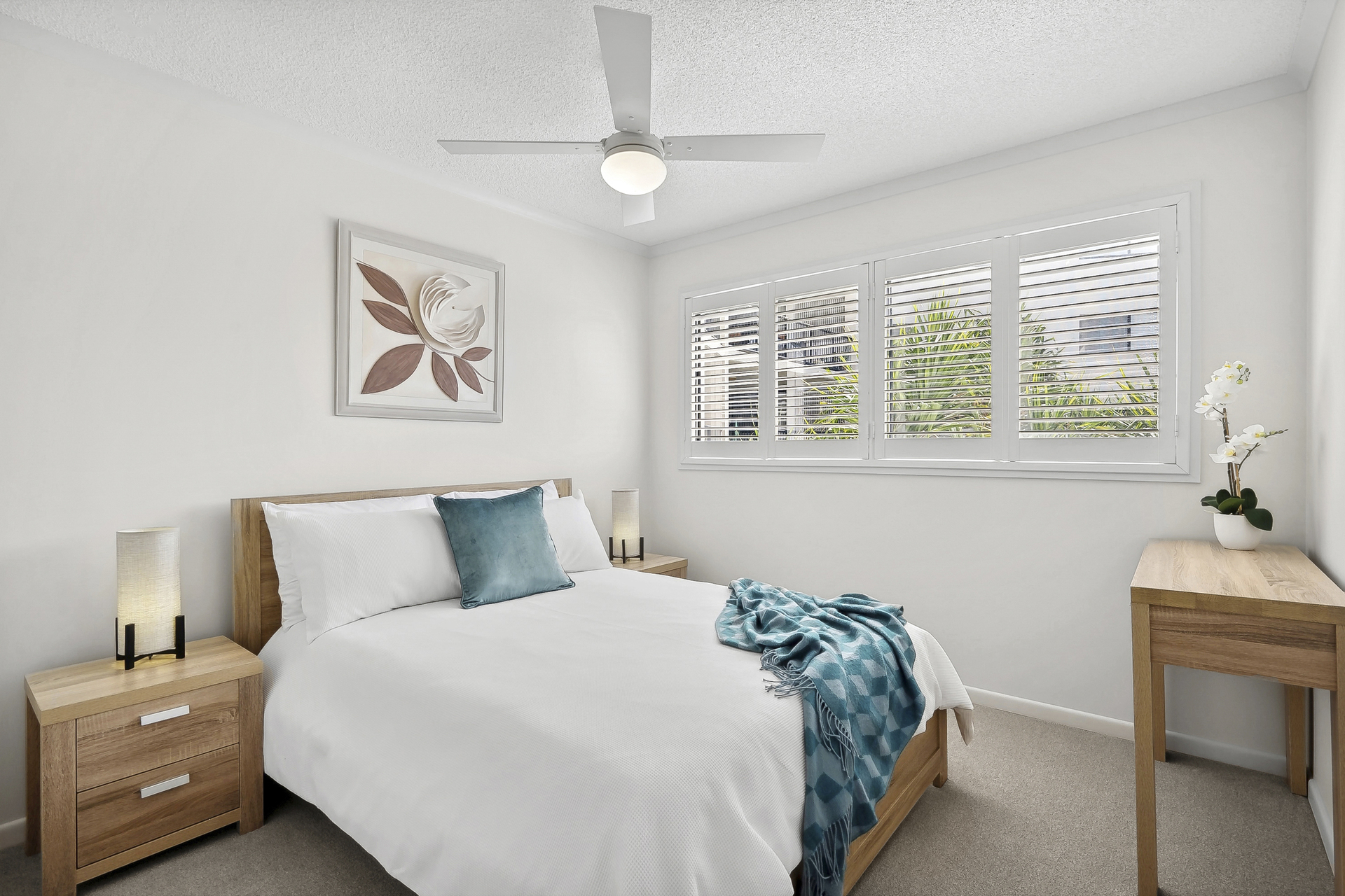 Impeccably presented and beautifully styled; features include plantation shutters, 1 x reverse cycle air-conditioner in living, ceiling fans, easy-care timber look flooring in living/kitchen, carpets in bedrooms, and shower over bath in main bathroom.